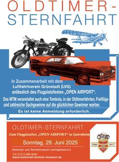 In Zusammenarbeit mit dem Luftfahrtverein Grünstadt (LVG) findet die Oldtimer-Sternfahrt des Motorrad- und Technikmuseums Leiningerland für Autos und Motorräder bis Baujahr 1990 auf dem Quirnheimer Berg, dem Fluggelände, statt. Wir bitten um ihr Verständnis, dass wir auch dieses mal keine Traktoren oder größere Lastkraft-Fahrzeuge annehmen können, da unser Ausstellungsareal wegen der Sicherheitsvorschriften auf dem Flugplatzgelände doch erheblich eingeschränkt wurde. Sicherheit gilt eben in erster Linie.