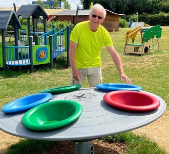 Manfred Guth, der Vorsitzende des Fördervereins des Schwimmbads in Hettenleidelheim, mit dem dem neuen Spielgerät Multispinner.