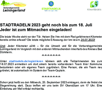 Die letzte Woche steht vor der Tür. Haben Sie Ihre mit dem Rad gefahrenen Kilometer bereits online erfasst? Die letzte mögliche Erfassung der km ist am 25.07.2023!