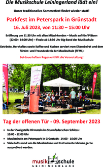 Als musikalischer Ausklang des ersten Halbjahrs findet die beliebte Open-Air-Veranstaltung „Parkfest“ noch einmal im Grünstadter Peterspark statt: Am Sonntag, 16.07. wird es wieder von einem Großteil der Schülerinnen und Schülern gestaltet. Zusammen stellen sie mit ihren Lehrkräften in zahlreichen Ensembles, Chören und Orchestern ein stattliches Programm auf die Beine. Die Eröffnung findet um 11:30 Uhr auf dem Zentralplatz statt. Anschließend, von 12:00 Uhr bis ca. 14:30 Uhr, wird auf fünf Plätzen des Petersparks zeitgleich musiziert und die Besucher können nach Lust und Laune ihr eigenes buntes Programm zusammenstellen und die schöne Parkatmosphäre genießen. Für die Verköstigung sorgen der Elternbeirat und der Förder- und Freundeskreis der Musikschule. Zur Müllvermeidung bitten die Verantwortlichen, Geschirr für den Eigenbedarf mitzubringen.