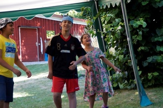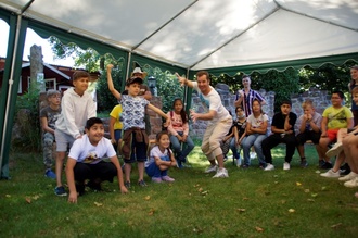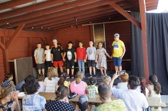 Hochkonzentriert waren alle dabei. Geübt wurde natürlich auch, wie Gewalt auf der Bühne dargestellt werden kann, ohne den anderen zu verletzen. Klatschende Ohrfeigen spielen begeisterte vor allem die Jungs besonders, aber nicht den Gesichtsausdruck vergessen. Auch wenn alle lachen mussten, auf der Bühne muss man im Bild bleiben, schließlich lacht niemand im echten Leben, wenn er geschlagen wird. Dies erforderte viel Disziplin und Konzentration. Was allen Teilnehmenden anfänglich schwer fiel, war nicht zu vergessen, dass jeder Teil des Schauspiels ist. Sobald der Vorhang fällt, selbst wenn man gerade keinen aktiven Part hat, Konzentration halten, den anderen nicht die Show stehlen und nicht vergessen: Keinen Popo-Alarm! Vermutlich neben lautem Lachen das häufigste Wort des Wochenendes! Schließlich sollte man als Darsteller:in den Zuschauern nicht den Rücken zudrehen, sondern zum Publikum spielen. All dies haben die Kinder und Jugendlichen mit Bravur gemeistert und so waren sie zu Recht stolz als es am Sonntag hieß: Bühne frei für ihre Theaterstücke. Eltern, Nachbarn, viele Zuschauer waren gekommen, um das Schauspiel bei schönstem Sonnenschein zu genießen. Mit viel Applaus und fröhlichen Menschen ging ein tolles Wochenende zu Ende. (Text und Fotos: Monika Grundmann)