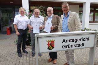 Bildunterschrift 1: Die neuen Schiedsleute Kurt Janson (Zweiter von links) und Ralf-Peter Riegel (Dritter von links) wurden im Beisein des Beigeordneten der Verbandsgemeinde Leiningerland, Bernd Findt (Erster von links) von Amtsgerichtsdirektor Michael Goldschmidt (rechts) ernannt.