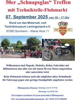 Es ist ein Treffen für Fahrzeuge mit maximal 50 ccm Hubraum, auch Schnapsglasklasse genannt. Dazu zählen Mopeds, Mokicks, Roller, also alles was mit solch einem kleinen Motor vorwärts bewegt wird. Diese Klasse erlebt zur Zeit einen ungewöhnlichen Hyphe. Das kommt daher, dass man diese Fahrzeuge und seien sie in einem noch so schlechten Zustand für relativ wenig Geld wieder zum Laufen bringen kann. Die Pioniere dieser Fahrzeugklasse waren Anfang der 50er Jahre die Firmen NSU, Miele, Kreidler, Zündapp und noch einige mehr. Deshalb ist die Typen- und Modellvielfalt fast grenzenlos. Es ist damit zu rechnen, dass es da allerhand zu sehen geben wird. Eine Anmeldung ist nicht erforderlich.