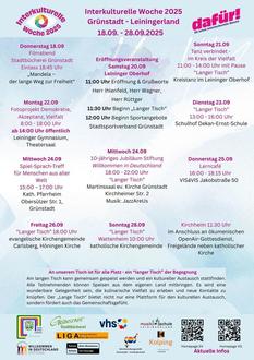Vom 18. bis 28. September findet die zweite Interkulturelle Woche in Grünstadt und der VG Leiningerland statt, unter der Schirmherrschaft von Landrat Hans-Ulrich Ihlenfeld. Das Motto „dafür“ ermutigt uns Stellung zu beziehen und uns für das FÜReinander auszusprechen. Daher soll es in Grünstadt und im Leiningerland während der IKW heißen: „An unserem Tisch ist für alle Platz - ein “langer Tisch” der Begegnung“. Am langen Tisch kann gemeinsam gespeist werden und ein kultureller Austausch stattfinden. Alle Teilnehmenden können Speisen aus dem eigenen Land mitbringen.