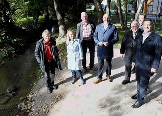 An dieser Stelle wird wohl ab 2023 renaturiert: der Eckbach in Dirmstein, Von links: Andreas Valentin, Planer der Renaturierung, Ministerin Katrin Eder, Ortsbürgermeister Bernd Eberle, Kreisbeigeordneter Sven Hoffmann, VG-Beigeordneter Karl Meister, Dennis Zimmermann (Leiter des Fachbereichs 2) und Bürgermeister Frank Rüttger