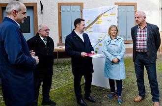 989.500 Euro wechseln den Besitzer: Ministerin Katrin Eder übergibt den Förderbescheid im Beisein des VG-Beigeordneten Karl Meister (links) und von Ortbürgermeister Bernd Eberle (rechts) an Bürgermeister Frank Rüttger.