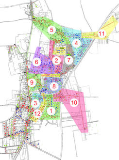 Der Plan zeigt Bockenheim mit den 12 eigenteilten Zonen in denen der Glasfaserausbau durch die Firma Demi Bau im Auftrag der Deutschen Glasfaser/Inexio durchgeführt werden soll. Für jede dieser Zonen ist ein vorläufiger Bauzeitenplan hinterlegt.