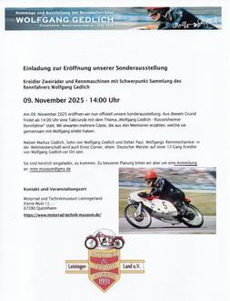 Am 9. November 2025 um 14 Uhr eröffnet das Motorrad- und Technikmuseum nun offiziell seine Sonderausstellung „Faszination Kreidler“ Aus diesem Grund findet ab 14 Uhr eine Talkrunde mit dem Thema „Wolfgang Gedlich – Rüsselsheimer Rennfahrer statt.
