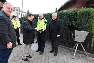Startschutz für die Testmessung von links Bürgermeister Bernd Frey VG Eisenberg, Oliver Müller von der Verkehrsüberwachung, Bürgermeister Frank Rüttger, Patrick Ricco (VG Eisenberg) und der für die Ordnungs- und Verkehrsbehörden zuständige Beigeordnete der VG Leiningerland, Bernd Findt.
