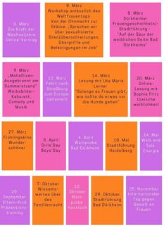 ich freue mich, Ihnen das gemeinsame Jahresprogramm der Gleichstellungsstellen Grünstadt/Leiningerland und des Landkreises Bad Dürkheim für das Jahr 2025 vorstellen zu dürfen. Auch in diesem Jahr erwarten Sie sowohl Workshops vor Ort als auch Online-Vorträge. Bei unseren Stadtführungen erfahren Sie spannende Geschichten über Frauen aus Bad Dürkheim und Heidelberg. Für humorvolle Unterhaltung sorgt mit Sicherheit das Kabarett der Weibsbilder. Im März fahren wir zudem nach Straßburg zum Europaparlament. Lassen Sie sich bei einer Lesung mit Ute Marie Lerner in die 20er-Jahre entführen. Beim Frühlingskino wird dieses Jahr der Film "Wunderschöner" vorgeführt. Auch in diesem Jahr heißt es wieder "Starke Frauen – Starke Weine" bei den Weinproben mit Janina Huber. Für Kinder und Eltern wird erneut ein Eltern-Kind-Präventionstraining angeboten. Ich würde mich sehr freuen, Sie bei einer der Veranstaltungen willkommen zu heißen.