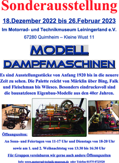 Unsere Sonderausstellung befasst sich mit dem Thema Modell-Dampfmaschinen. Auf einer Präsentationsfläche können einige Modelle dynamisch präsentiert werden. Sehr viele Modelle werden auch in Vitrinen ausgestellt.