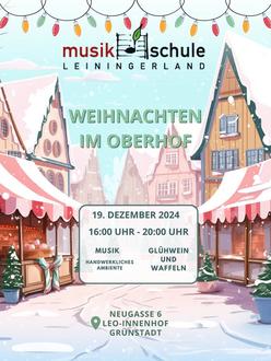 Im Anschluss an den Weihnachtsmarkt Grünstadt lädt die Musikschule zusammen mit der Bücherei zur Veranstaltung „Weihnachten im Oberhof“ ein. Die Besucher erwartet im Innenhof des historischen Schlosstrakts weihnachtliches Ambiente mit viel Musik, einer Märchenstunde sowie mit Handwerksbuden - und natürlich darf auch das Kulinarische nicht fehlen.