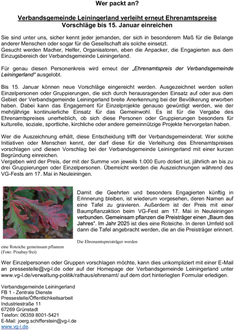 Wer Einzelpersonen oder Gruppen vorschlagen möchte, kann dies unkompliziert mit einer E-Mail an pressestelle@vg-l.de oder auf der Homepage der Verbandsgemeinde Leiningerland unter