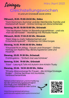 Die Teilnahme ist kostenlos, Anmeldung bei der Gleichstellungsbeauftragten Kira Wolf: kira.wolf@gruenstadt.de, 06359/805-104 oder online unter: www.gruenstadt.de/rathaus-politik/verwaltung/gleichstellung/terminvorschau/