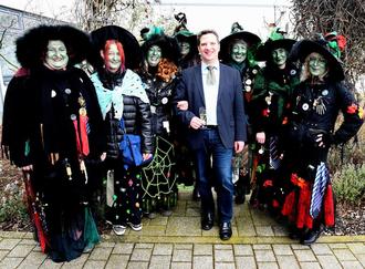 Die Frauen waren bereits am Vormittag in der Gemeinde unterwegs, um von Passanten, Geschäftsleuten und Autofahrern Spenden einzusammeln, die sie schon wie in den 28 Jahren zuvor stets für gute Zwecke gespendet wurden. Klar, dass auch Bürgermeister Frank Rüttger die närrischen Frauen mit einem Spendenumschlag überraschte. Das Geld geht dieses Jahr an den Wünschewagen vom ASB, das Kinderhospiz "Sterntaler" und die "Friends of children Nepal". Im Anschluss mussten sich die Herren der Obrigkeit von den Hexen noch eine "kleine" Verwandlung gefallen lassen. Aus Frank Rüttger, Raimund Hoffmann und Jürgen Hofmann machten die Hexen mit bunten Kitteln und Kleidern und mit Hilfe von Make-up ebenfalls schaurig schöne Hexen.