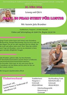 Anlässlich des Weltfrauentags wird in Zusammenarbeit mit der Stadtbücherei eine Lesung veranstaltet. Comedienne und Autorin Julia Brandner wird am 20. März aus ihrem Buch „Das L in Frau steht für lustig“ vorlesen. Einlass und Sektempfang starten um 19:00 Uhr in der Stadtbücherei Grünstadt. Pünktlich um 19:30 Uhr beginnt die Lesung. Tickets sind bei der Stadtbücherei, der Buchhandlung Frank und der Gleichstellungsstelle erhältlich.