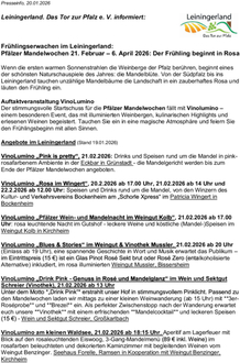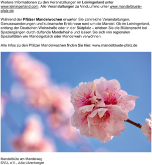 Weitere Informationen zu den Veranstaltungen im Leiningerland unter www.leiningerland.com. Alle Veranstaltungen zu VinoLumino unter www.mandelbluete-pfalz.de