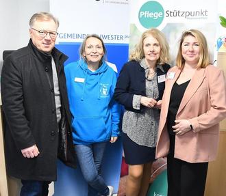 Der Erste Beigeordnete Bernd Findt besucht beim Tag der Offenen Tür den Pflegestützpunkt und die Gemeindeschwester plus. Von links: Bernd Findt, Gemeindeschwester plus Birgit Langknecht, Doris Hoyer-Willy und Anna Iljuschkina vom Pflegestützpunkt. (Text/Foto: J. Schifferstein/VG Presse- und Öffentlichkeitsarbeit)