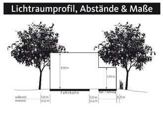 Wir weisen darauf hin, dass das sogenannte Lichtraumprofil (im Bereich von Gehwegen 2,50 m Höhe, bei Fahrbahnen 4,50 m Höhe) und bei Einmündung von Straßen ein ausreichender Sichtwinkel unbedingt von Begrünung freigehalten werden muss. Entlang des Anwesens ist der Bewuchs mindestens bis zur Gehweg-/Fahrbahnhinterkante zurück zu schneiden. Verkehrszeichen und Straßenlampen, die durch die Anpflanzung verdeckt werden, sind frei zu schneiden.