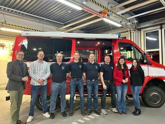 v.l.n.r. Erster Beigeordneter Claudius Güther, Florian Moritz (Leiter für den Bereich Öffentliche Sicherheit und Ordnung | Stadt Bad Dürkheim), stellvertretenden Wehrleiter Thorsten Schacht, stellvertretenden Wehrleiter Peter Schneeganß, Wehrleiter Boris Ronstadt, stellvertretender Wehrleiter Markus Lang, Bürgermeisterin Natalie Bauernschmitt und Hanna Lichtenwald (Sachbearbeiterin für die Feuerwehrverwaltung und das kommunale Krisenmanagement | Stadt Bad Dürkheim)