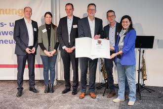 v.l.n.r. Landtagsabgeordneter Markus Wolf, Stadtplanerin Maria Zorn, Ortsbeiratsmitglied Torben Brake, Innenminister Michael Ebling, Ortsvorsteher Andreas Wolf und Bürgermeisterin Natalie Bauernschmitt mit der Urkunde zur Anerkennung des Stadtteils Ungstein der Stadt Bad Dürkheim als Investitions- und Maßnahmenschwerpunkt in der Dorferneuerung. | Copyright: Innenministerium RLP/Stephan Dinges