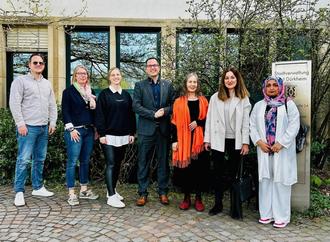 v.l.n.r. Florian Moritz (Leiter Öffentliche Sicherheit und Ordnung), Carolin Müller-Zaun (Sachbearbeiterin Asyl/Obdachlose Stadtverwaltung Bad Dürkheim), Saskia Umlauff (Teamleitung Asyl/Obdachlose, Stadtverwaltung Bad Dürkheim), Erster Beigeordneter Claudius Güther, Ilona Hocker-Meinzer (Vorsitzende des Beirates für Migration und Integration), Anna Britaeva (Beirat für Migration und Integration) und Fatemah Mahboob (Beirat für Migration und Integration)