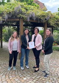 v.l.n.r. Klimaschutzmanagerin Cara Buschlinger, Bürgermeisterin Natalie Bauernschmitt, Staatssekretärin Petra Dick-Walther und Klimaschutzmanagerin Anja Aufschneider bei der Übergabe des Förderbescheids im Rahmen des KIPKI