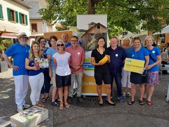 Viele Passantinnen und Passanten blieben stehen, angelockt vom vielfältigen Angebot: Einkaufskörbe, gefüllt mit kleinen Geschenken des Weltladens, warteten auf glückliche Gewinner des Glücksrads. Die Kreisverwaltung informierte auf Stellwänden über den fairen Landkreis und einige seiner Akteure – darunter die von-Carlowitz-Realschule in Weisenheim am Berg. Dort winkte fair gehandelter Landkreiskaffee als Preis. Die Stadt Bad Dürkheim lockte mit Gutscheinen für einen kostenlosen Eintritt ins Salinarium, das Pfalzmuseum bot Familienfreikarten an. Kulinarisch rundeten faire Bananen und Eistee vom Leprima Biomarkt das Angebot ab.