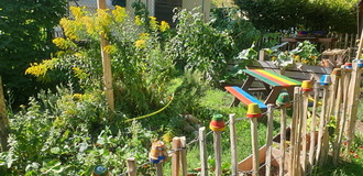 Wir versuchen nicht nur die Pflanzen- und Tierwelt vielfältiger und bunter zu gestalten, sondern im Sinne der Ganzheitlichkeit auch unseren gesamten Garten. In diesem Prozess bemalten die Kinder die kleinen-Kinder-Sitzgarnituren bunt und gestalteten wetterfeste bunte Wimpelketten. Auch der Staketenzaun unseres Gemüse- und Kräutergärtchens bekam kreativ bepinselte Tontöpfe, die als Zaunhocker auf die Pfahlspitzen gesetzt und geschraubt wurden. Unsere Wiese wurde vertikutiert, gedüngt und bekam nun eine Ruhepause von 3 Wochen, bis wir in den Ferien sind.