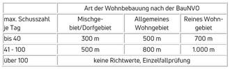 Die Erlaubnis wird erteilt, wenn - abhängig von der Schusshäufigkeit und der Art der Wohnbebauung sowie ggf. unter Berücksichtigung besonderer Geländeverhältnisse - bestimmte Mindestabstände eingehalten werden. Diese wurden auf Landesebene als Richtwerte abgestimmt. Die Gemeindeverwaltung prüft die Erlaubnisfähigkeit anhand der Angaben des Antragstellers.