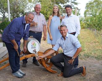 v.l.n.r. Wurstmarktwinzermeister Helmut Darting, Wurstmarktdezernent Karl Brust, Dürkheimer Weinprinzessin Lea I., Bürgermeister Christoph Glogger, Wurstmarktmeister Marcus Brill