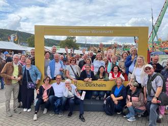 Im Anschluss ging es zurück zum Festgelände, wo im Weindorf ein kulinarischer Mittagsimbiss mit Umtrunk auf die Gruppe wartete. Wer danach Lust auf Nervenkitzel hatte, probierte eine der zahlreichen Fahrattraktionen aus oder schlenderte gemütlich über den Wurstmarkt.