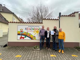 v.l.n.r. Ortsvorsteher von Ungstein Andreas Wolf, Leiterin des Kindergartens Regenbogen Carolin Müller-Zaun, Erste Beigeordnete Judith Hagen und Annette Stierl, Sachbearbeiterin der Stadtverwaltung Bad Dürkheim für Fairtrade