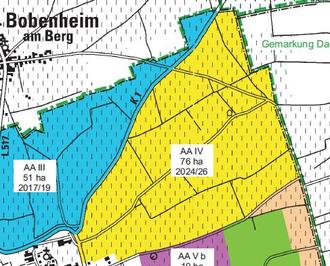 Der geplante Aufbauabschnitt der Flurbereinigung Weisenheim am Berg IV (s. Karte) verschiebt sich laut Beschluss der Mitgliederversammlung der Aufbaugemeinschaft vom 07.11.2023, da zum Zeitpunkt der vorgesehenen Beschlussfassung der Aufbaugemeinschaft über die Abräumung der Weinberge noch kein Baurecht vorliegt, um ein Kalenderjahr.