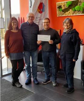 Die Vertreter der Genossenschaft Froh2Wo eG, Sabine Koschorrek, Gertrud Klamm und Manuel Funke überreichten dem Geschäftsführer des Vereins für Familienförderung Olaf Tali am 23. Januar 2024 im Mehrgenerationenhaus MGH einen Spendenscheck in Höhe von 500 Euro.