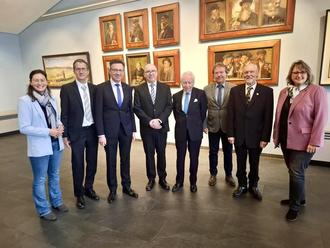Bürgermeisterin Natalie Bauernschmitt (v. l.) und Sozialdezernentin Angela Strobel (v. r.) mit dem „Sechser Gremium“ der Valentin-Ostertag-Stiftung bei der Spendenübergabe | Andreas Wolf, Dr. Michael Orth, Thomas Kalbfuß, Vorsitzender Bernd Kirsch, Prof. Dr. Klaus Karst und Kurt Freund