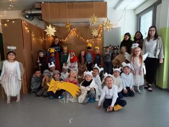 Das letzte Adventstreffen fand nicht wie gewöhnlich in der Schule statt. Die Vorschulkinder haben die Schüler sowie Lehrer in die Kita eingeladen, um auch ihnen das Theaterstück vorzuführen. Am 20.12.2022 war es dann soweit. Pünktlich um 11 Uhr haben sich die Grundschüler und Lehrer in der Turnhalle unserer Einrichtung zusammengefunden und waren sichtlich erstaunt, wie souverän die Vorschulkinder das Krippenspiel ihnen vorgespielt haben. Auch hier haben unsere Kinder einen großen Applaus erhalten. Anschließend haben uns die Grundschüler mit weihnachtlichen Liedern überrascht. Die Vorschulkinder stimmten bei Liedern wie „Oh Tannenbaum“ mit ein. Außerdem hatte eine Schülerin mit ihrer Blockflöte ein Weihnachtslied eingeübt und spielte dies den Kindern vor. Somit war die Weihnachtsstimmung perfekt und sowohl die Kinder als auch Erwachsene bestens auf Weihnachten eingestimmt. Vielen Dank an die Lehrer und GS-Kinder für die Mühe und Vorbereitung dieser Überraschung. Das war ein schöner Abschluss der diesjährigen Adventstreffen. Wir freuen uns schon auf nächstes Jahr.