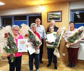Die Vorstandschaft bedankte sich mit einer Urkunde, der silbernen Vereinsnadel und einem Blumengebinde bei Buhrmann Erika, Brühmüller Karin, Danner Anita und Krupp Rosemarie für ihre 10jährige Sangestätigkeit beim MGV 1855 Imsbach e.V.