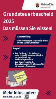 Bei Fragen zu ihrem neuen Grundsteuerbescheid, welcher Ihnen Anfang 2025 zugeht, insbesondere zur Zahlung/Fälligkeit oder zum Hebesatz, wenden Sie sich bitte an die Verbandsgemeindeverwaltung (info@winnweiler-vg.de oder 06302/602-0).