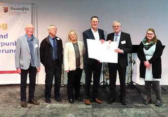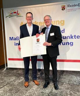Innenminister Michael Ebling überreichte Ortsbürgermeister Jürgen Berberich, Ratsmitglied Tanja Berberich sowie den beiden Gonbacher Ehrenbürgern Bernd Feldner und Waldemar Maas die Anerkennungsurkunde im ZDF-Konferenzzentrum in Mainz. Die Kreisverwaltung Donnersbergkreis war durch Frau Anna Borck vertreten.
