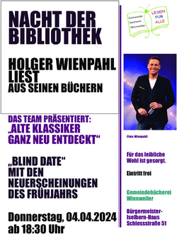 Lesen – Hören – Ins Gespräch kommen: Mit dieser Idee lädt das Team der Gemeindebücherei Winnweiler am Donnerstag, 4. April 2024 ab 18:30 Uhr zu einer „Nacht der Bibliothek“ ins Bürgermeister-Iselborn-Haus am Schlossplatz ein. Der Eintritt ist frei. Als Ehrengast ist der bekannte SWR-Moderator und Buchautor Holger Wienpahl eingeladen und er eröffnet den Abend mit einer kurzweiligen Lesung aus seinen Büchern wie "Das Wandern ist des Mörders Lust", "Glücksorte in Kaiserslautern" und "Wandern für die Seele". Nicht fehlen darf natürlich das Märchen "Die Geschichte von der Prinzessin, die nicht einschlafen konnte", eine Herzensangelegenheit seiner Familie und auch vieler Leserinnen und Leser.
