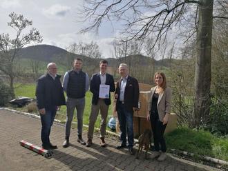 Auszeichnung für Hofgut Neumühle (von links): Rudolf Jacob, Verbandsbürgermeister von Winnweiler, Johannes Steinfort und Dr. Jason Hayer vom Hofgut Neumühle, Landrat Rainer Guth und Manuela Asenjo Fritz, Klimaschutzmanagerin des Donnersbergkreises