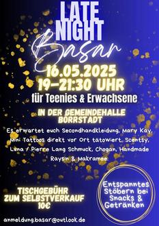 Die Vorbereitungen für unseren nächsten Basar am 16.05.2025 laufen bereits. Alle Informationen hierzu sind in unserem Flyer ersichtlich.