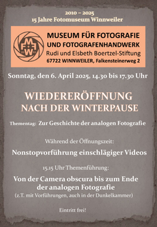 Das Museum für Fotografie und Fotografenhandwerk Rudi und Elsbeth Boertzel-Stiftung Winnweiler, Falkensteinerweg 2, das in diesem Jahr 15 Jahre alt wird, hat seine Winterpause beendet. Es ist am Sonntag, den 06.04.2025 in der Zeit von 14.30 bis 17:30 Uhr geöffnet. Eingeladen wird zu einem Thementag „Geschichte der analogen Fotografie“. Während der Öffnungszeit werden im Atelier nonstop einschlägige Videos und Bilderserien vorgeführt. Ab 15:15 Uhr findet eine Themenführung statt: „Von der Camera obscura bis zum Ende der analogen Fotografie. Aspekte der Fotografiegeschichte.“ Dazu gehören auch einige Vorführungen, u. a. auch in der Dunkelkammer.