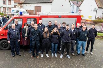 Die neu gegründete Feuerwehr der Gemeinde Höringen, links VG Bürgermeister Rudi Jakob, VG Wehrleiter Christian Christian Füllert sowie Ortsbürgermeisterin Brigitte Enders.