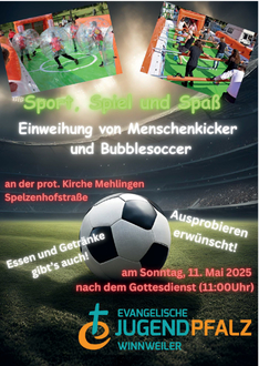 Jetzt steht der Termin für die offizielle Einweihung fest: Am Sonntag (Muttertag), den 11. Mai, direkt nach dem Gottesdienst auf dem Grundstück der prot. Kirchengemeinde in Mehlingen. Eingeladen sind alle, die einmal testen wollen, wie viel Spaß der Menschenkicker macht!