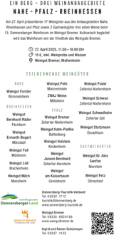 Veranstalter sind der Donnersberg-Touristik-Verband und Ingrid und Rainer Schulmeyer in Zusammenarbeit mit dem Weingut Bremer.