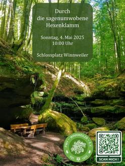 Weiterer Treffpunkt ist der Parkplatz an der Stockwaldhütte Winzeln (bei Pirmasens). Abmarsch dort ist um 11:00 Uhr. Der Wanderführer ist Hermann Schüßler. Wir fahren mit eigenen PKWs nach Winzeln bei Pirmasens und begeben uns auf den Premiumwanderweg durch die Hexenklamm um die sich viele Mythen ranken. Im Anschluss der Rundwanderung kann in die Stockwaldhütte des PWV Winzeln nach Belieben eingekehrt werden. Es geht über teils schmale Pfade. Schwindelfreiheit ist Voraussetzung. Bitte festes Schuhwerk und ggfs. Wanderstöcke mitführen.