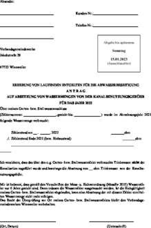 Es besteht auch die Möglichkeit, die durch geeichten Zwischenzähler festgestellte Wassermenge, die nachweislich nicht der Kanalisation zugeführt wurde, abzusetzen. Der Antrag kann mit einem formlosen Schreiben oder einem Vordruck, der in dieser Ausgabe abgedruckt ist, erfolgen und ist bis spätestens Sonntag, 15. Januar 2023 bei den Verbandsgemeindewerken, Jakobstraße 29, Gebäude 2, 2. Etage, 67722 Winnweiler, einzureichen.
