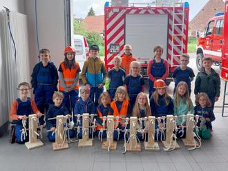 Die Bambinis der Jugendfeuerwehr Münchweiler präsentieren stolz ihre Knotenbäume